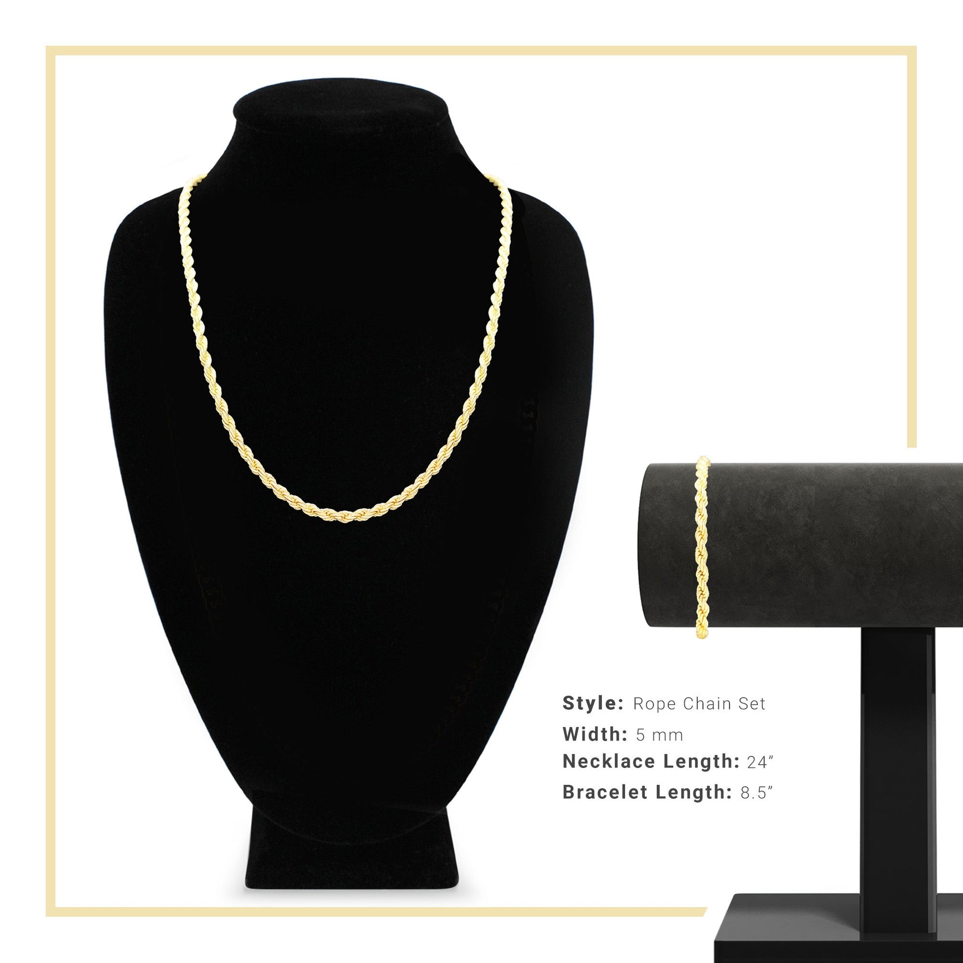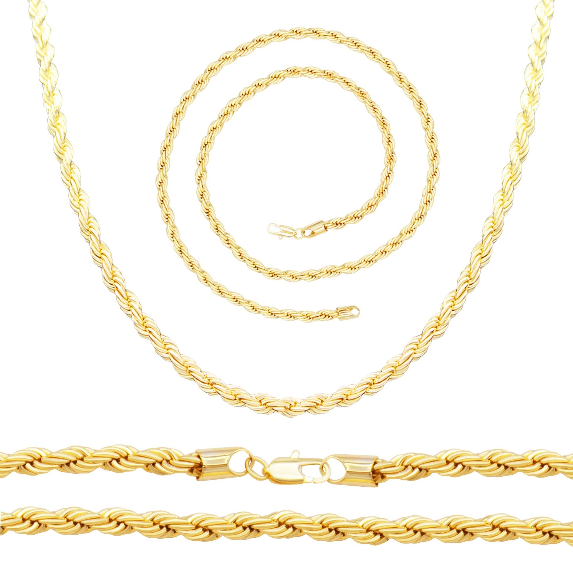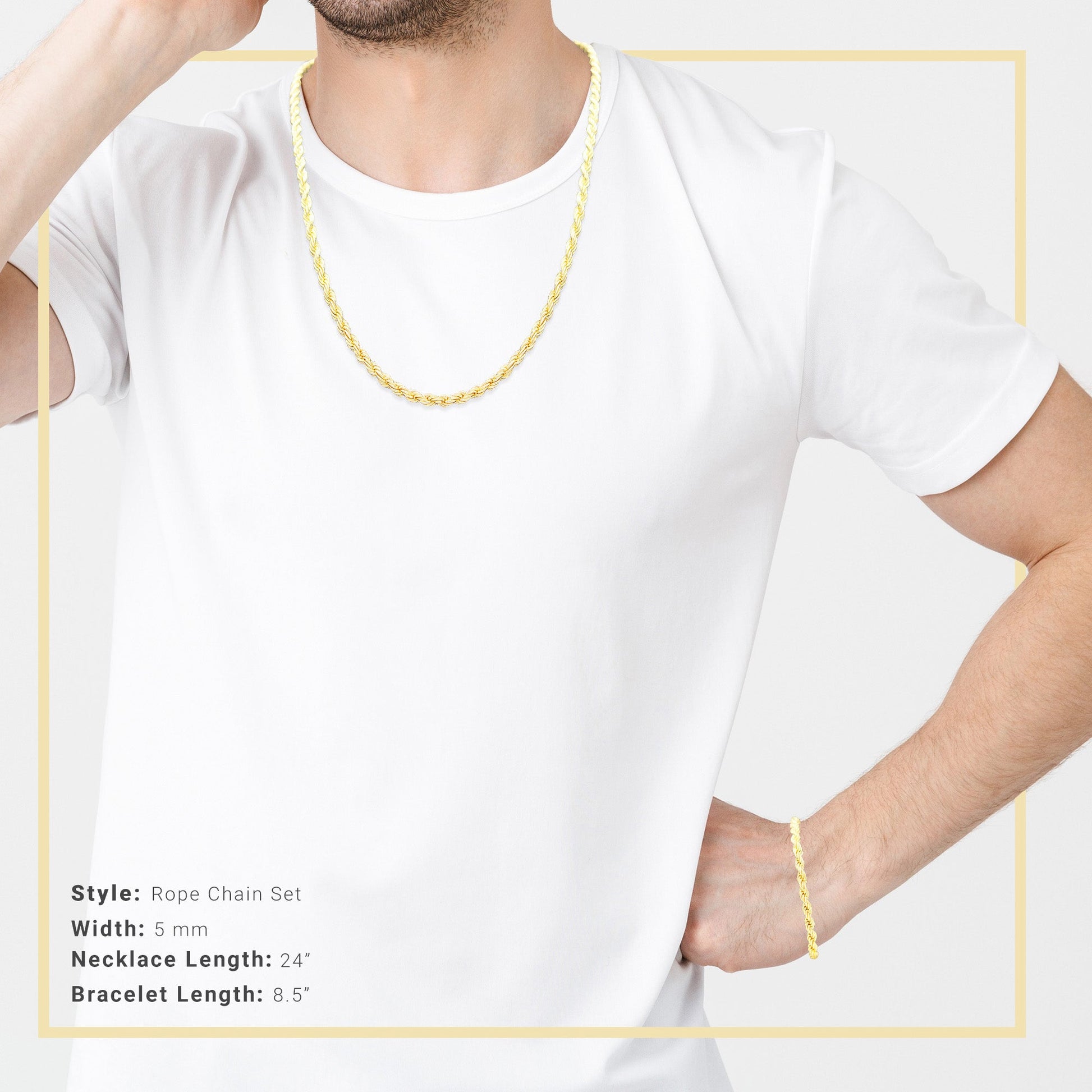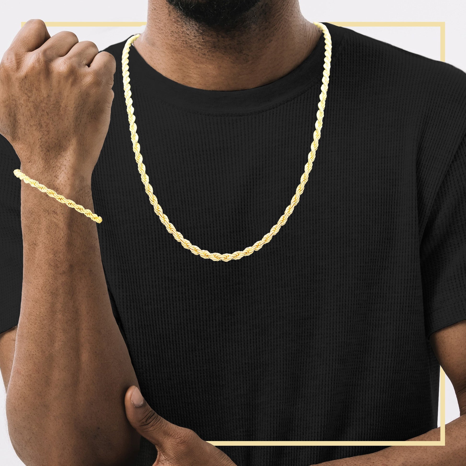 This chic 14K gold filled rope chain set for men is understated yet sophisticated, sure to draw attention wherever you go. Made from pure 14K gold-filled copper and with a highly polished, glossy finish, our rope chains are hypoallergenic, nickel-free, and suitable for delicate skin types.