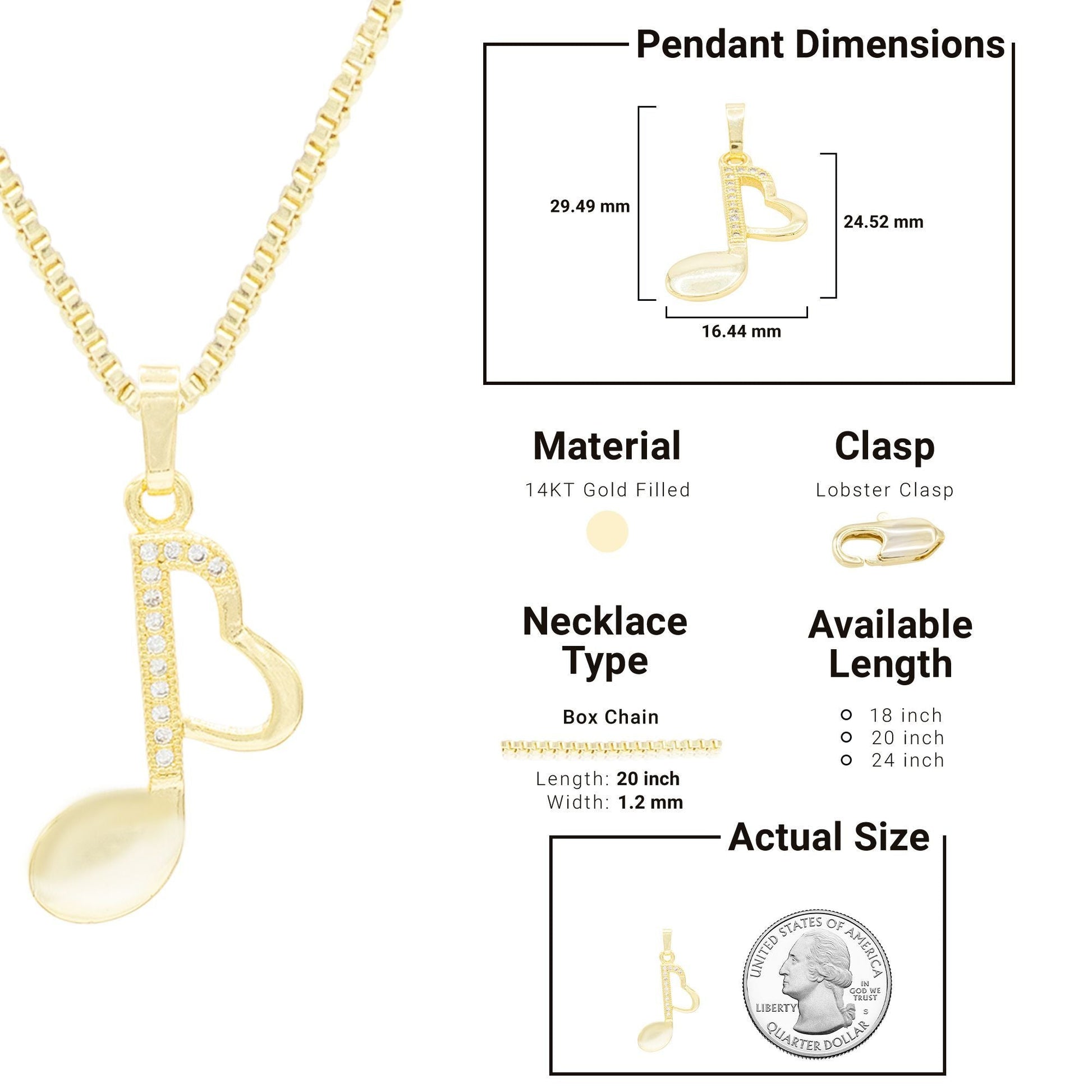 Make a statement with our 14K Gold Filled Music Heart Note Pendant adorning a stunning Necklace Chain. This elegant Women's Jewelry Set elevates any attire, offering three versatile necklace styles: Box Chain, Rope Chain, or Cuban Link. Available in lengths of 18”, 20”, and 24”, ensuring the perfect fit for every occasion.