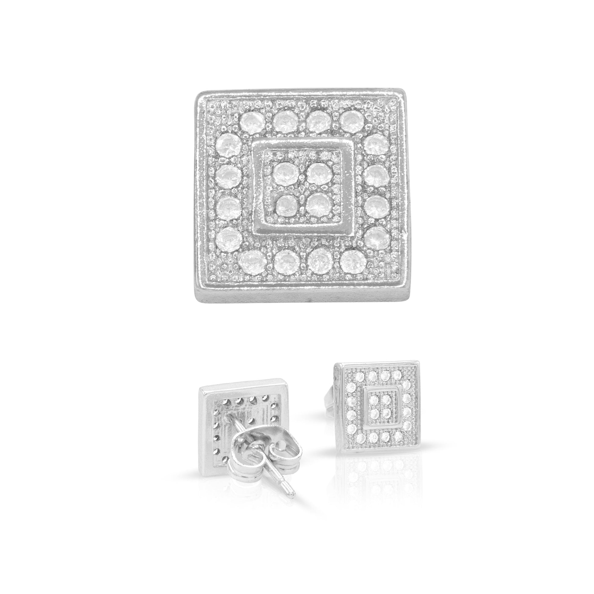 - Square studs with cubic zirconia stones; dimensions: 8 mm x 13.5 mm
