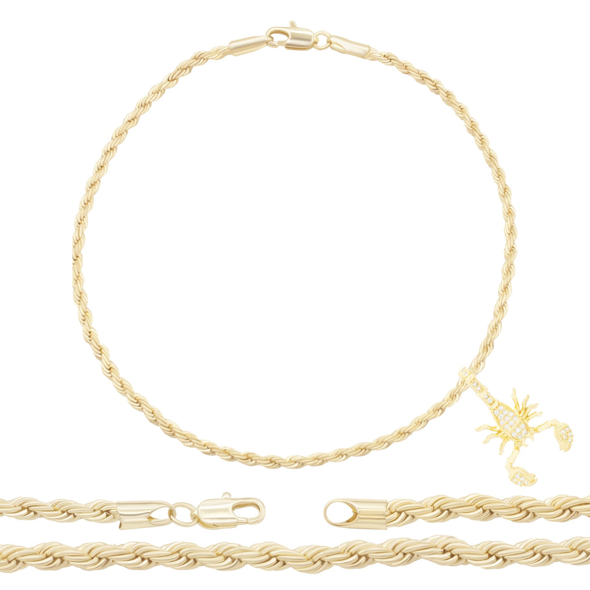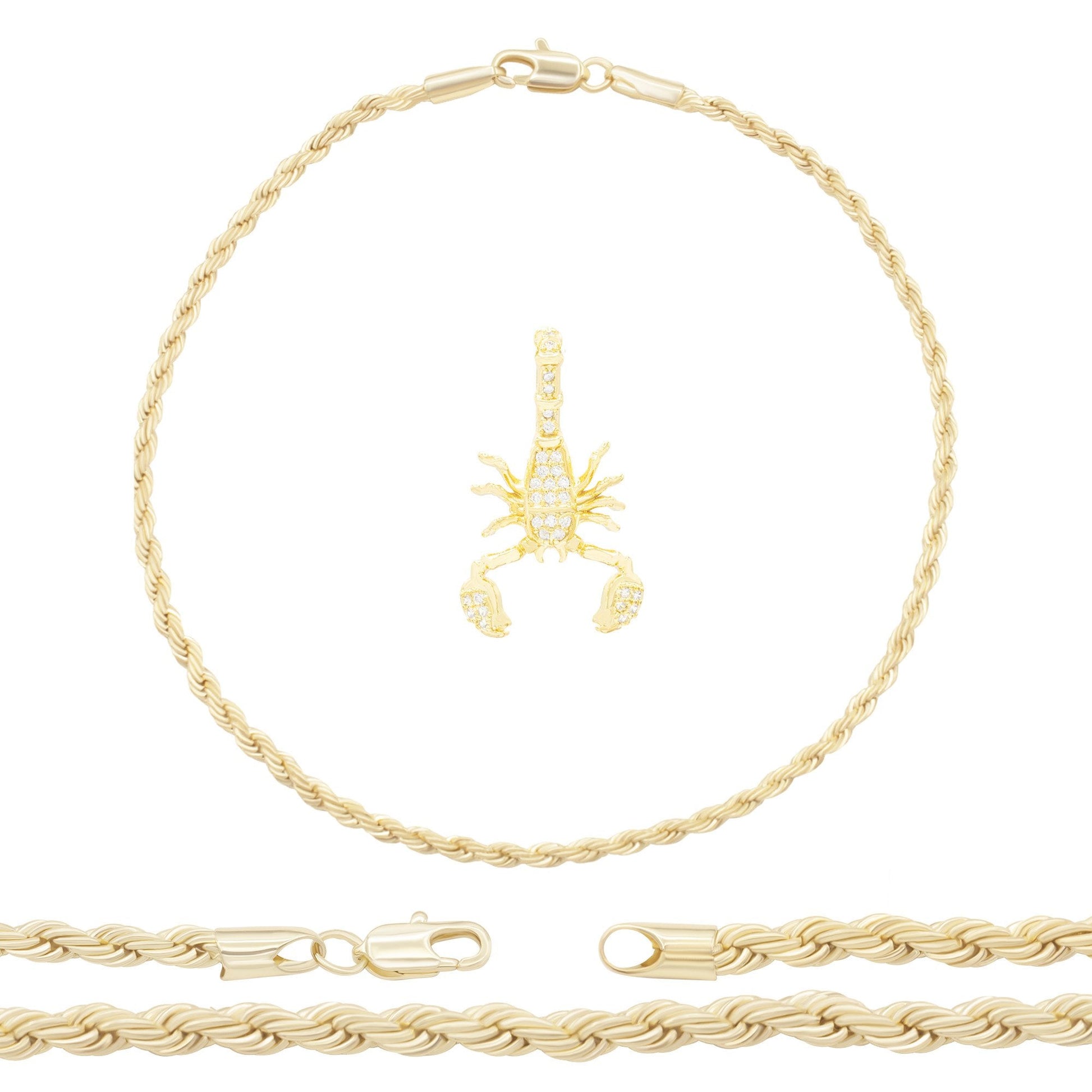 Every piece of jewellery arrives in a classy jewellery gift box. For any lady, girl, or youngster, the 14K gold filled CZ Scorpion Pendant with Rope Chain Anklet Bracelet is a wonderful trendy jewellery present.
